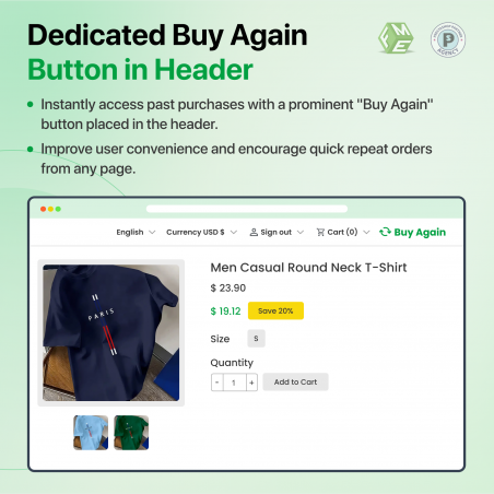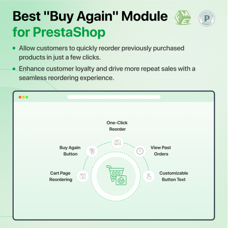 Prestashop Buy Again - One Click Reorder Module permite que os clientes reordenem seus produtos anteriores com um único clique. Este módulo cria um botão Buy Again na parte superior da página inicial de onde o cliente pode acessar todos os seus produtos antigos encomendados e encomendar qualquer um se quiser.