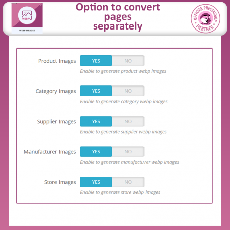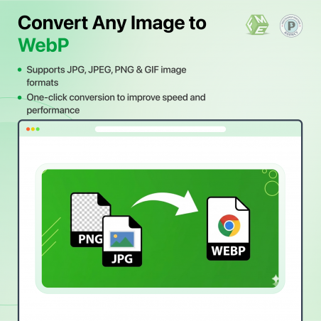 Um clique no módulo Prestashop de Conversão de Imagem WebP da FME converte todas as imagens da sua loja em formato webP com um único clique. WebP é um formato de imagem do Google que reduz significativamente o tamanho da imagem sem comprometer a qualidade.