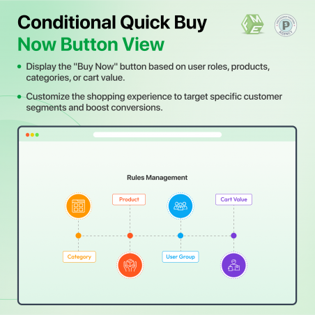 Os administradores podem optar por exibir o botão "Comprar Agora" em páginas específicas de produtos a partir do back-end em uma regra. Há também a opção de mostrar o botão em toda a loja ou em categorias selecionadas. Além disso, o módulo permite o direcionamento de grupos de usuários específicos, garantindo que este recurso esteja disponível apenas para segmentos de clientes designados.