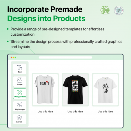 Os administradores podem adicionar designs predefinidos para cada produto, permitindo que os usuários apliquem esses designs com um único clique, simplificando o processo de personalização e melhorando a experiência do usuário.