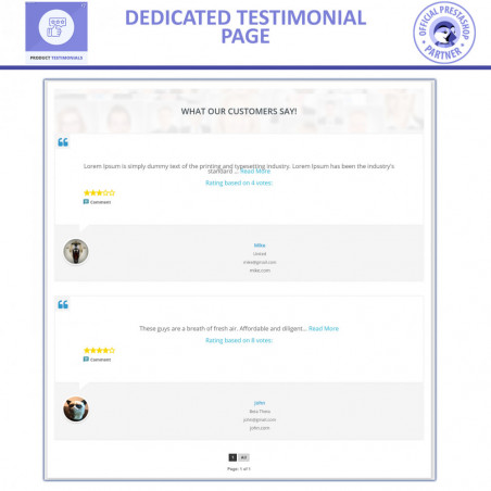 Product Testimonials Module allows your customer to give their reviews for the specific page or for the whole website which are displayed on a separate page. Users can also rate other reviews.