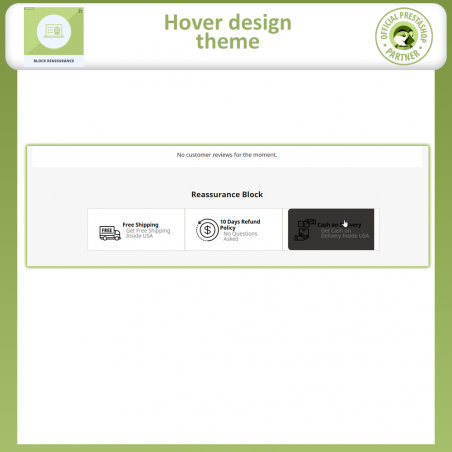 Los bloques de seguridad ofrecidos por Prestashop por defecto son de una naturaleza muy básica. Si desea entregar un mensaje perfecto a sus clientes que aumente la confiabilidad de su tienda, entonces Block Reassurance with Animation es el módulo para usted.