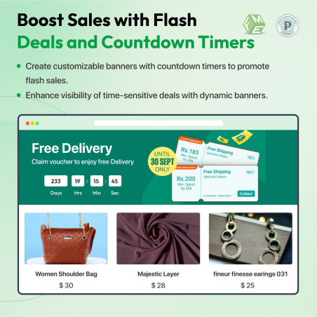 Muestre las ventas flash de cuenta regresiva para eventos especiales en su sitio web de una manera atractiva. Puede crear ventas flash para fecha y hora específicas y reducir los precios de los productos con respecto al porcentaje y la cantidad. El temporizador de cuenta regresiva ayuda a convertir a más visitantes, ya que aumenta la curiosidad y el entusiasmo de los clientes por obtener el trato.