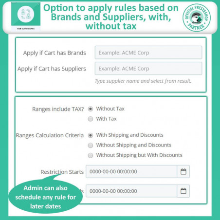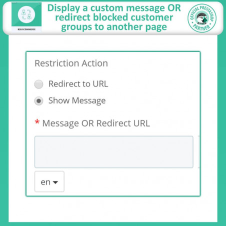 Transformez votre boutique PrestaShop en une plateforme de commerce électronique B2B robuste avec notre module PrestaShop B2B. Conçue pour relever les défis uniques du commerce B2B, cette solution tout-en-un intègre des fonctionnalités essentielles telles que les devis de produits, les inscriptions B2B, les restrictions de groupes de clients et les restrictions de modes de paiement.