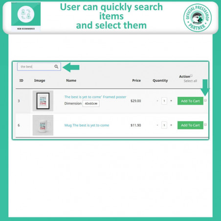 En général, les clients B2B commandent des articles en gros. Cela devient une tâche très chronophage s'ils doivent rechercher chaque produit, accéder à sa page produit, l'ajouter au panier, puis passer à la caisse. Le tableau de commande rapide permet aux clients de rechercher rapidement des produits, de sélectionner leur combinaison, de sélectionner la quantité et de les commander tous à partir d'une seule page.