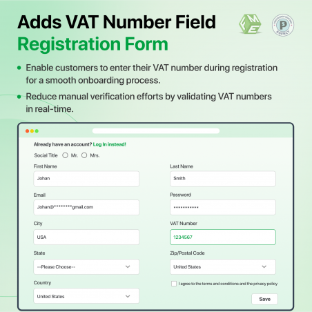 Le module Valider le numéro de TVA et attribuer au groupe de clients vous permet de valider les numéros de TVA au moment de l’inscription. Forcer les clients B2B à valider les numéros de TVA.