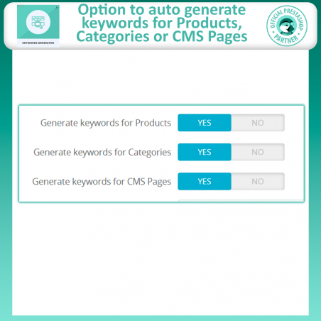 Prestashop Keyword Generator Advance vous permet de générer automatiquement des méta-mots-clés pour l’ensemble de la boutique en un seul clic. Possibilité de générer séparément des mots-clés pour les produits, les catégories ou les pages CMS.