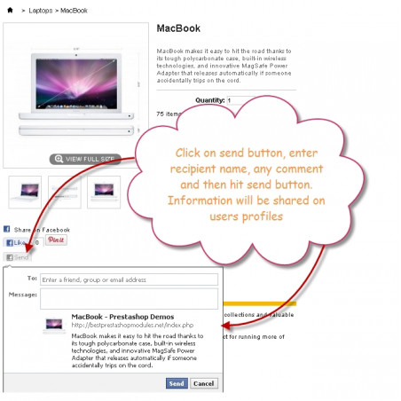 Avez-vous découvert quelque chose de précieux et souhaitez-vous le partager avec vos amis Facebook? Le module de bouton d’envoi Facebook prestaShop vous permet de partager instantanément tout le contenu précieux avec votre communauté Facebook. Facebook est l’une des grandes sources de génération de ventes pour des millions de marchands. Ce plugin place le bouton Envoyer Facebook similaire au bouton J’aime de Facebook sur les pages de produits et le pied de page du site Web. En cliquant sur le bouton, vous ouvrez une fenêtre contextuelle contenant les champs « À » et « Message », entrez le nom du destinataire et tout message, puis appuyez sur le bouton d’envoi.