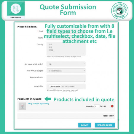 Abilitando questa funzionalità, i tuoi clienti B2B di PrestaShop possono inviare facilmente preventivi di prodotto, semplificando la comunicazione e aumentando il coinvolgimento. Ciò non solo migliora l'esperienza di acquisto, ma ti aiuta anche a catturare preziose opportunità di vendita.