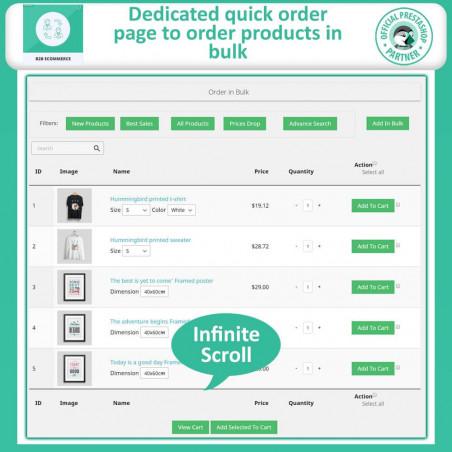 Questa funzionalità di pagina di ordinazione dedicata del modulo PrestaShop All-in-One B2B, aggiunge lo scorrimento infinito e supporta persino il caricamento di file CSV per una maggiore praticità. Limitando l'accesso a questa funzionalità ai gruppi di clienti B2B, gli amministratori assicurano un'esperienza di ordinazione personalizzata ed efficiente, aumentando in definitiva la soddisfazione del cliente e stimolando le vendite.