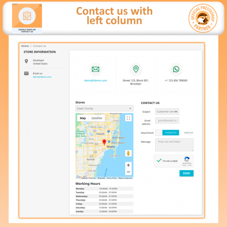 Drie prachtige pictogrammen tonen uw standaard winkellocatie en contactnummer met adres. Er is ook een optie voor gebruikers om een bestand bij hun query te voegen. Om spam te stoppen, heeft onze module ook een optie om captcha op het contactformulier op te nemen.