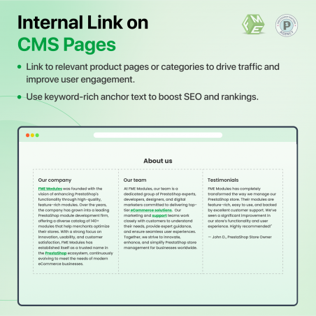 Z łatwością twórz linki wewnętrzne do swojego sklepu dzięki modułowi SEO Internal Linking PrestaShop firmy FME. Wybierając kilka opcji, moduł ten automatycznie utworzy linki wewnętrzne.